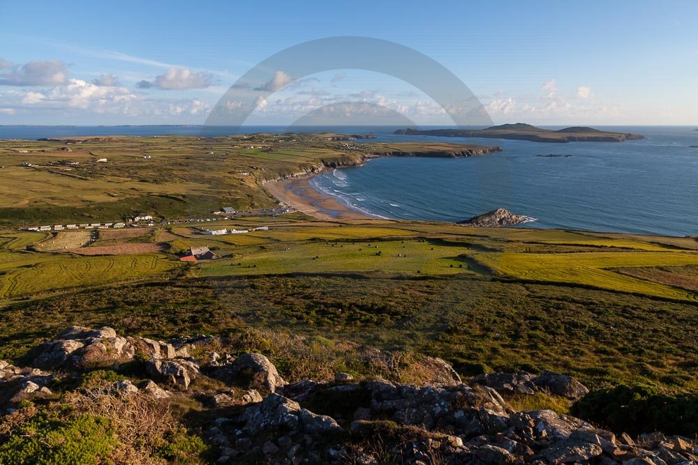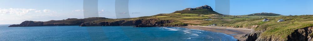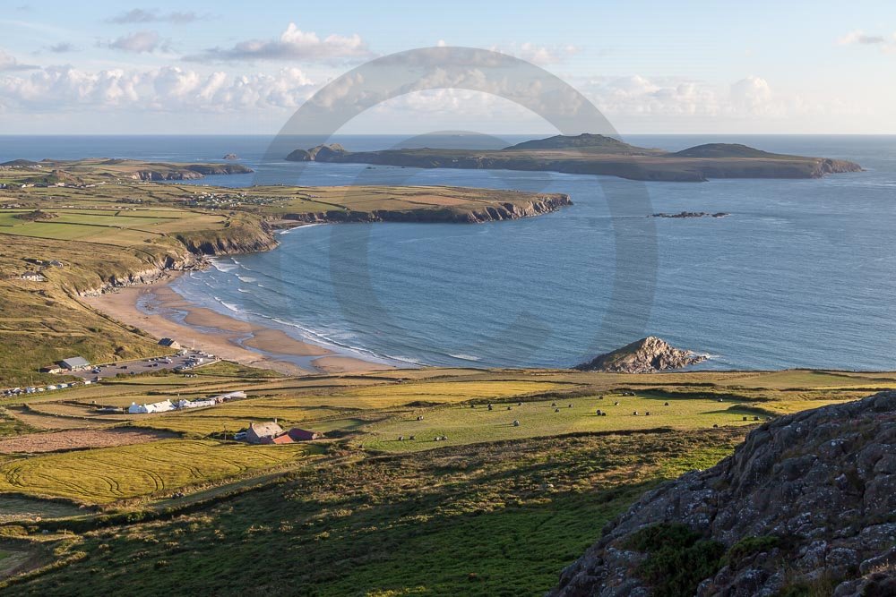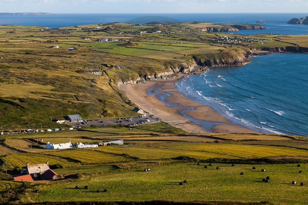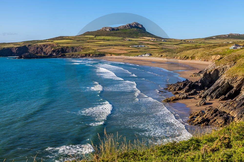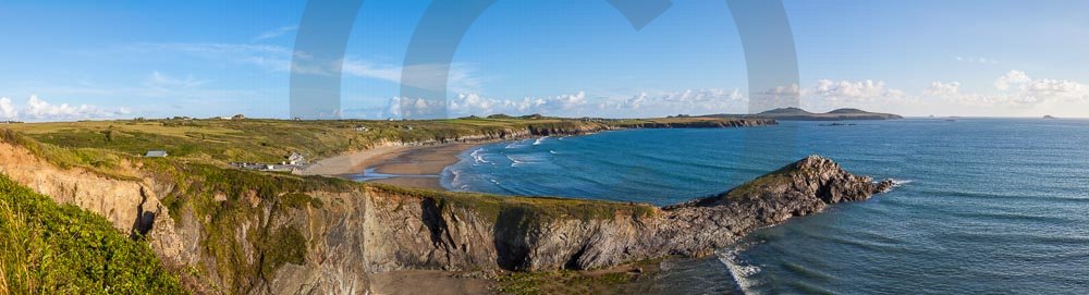 The stunning coastline around Whitesands beach with views of the sea and hills behind. Located on the St Davids penisula in Pembrokeshire, West Wales.