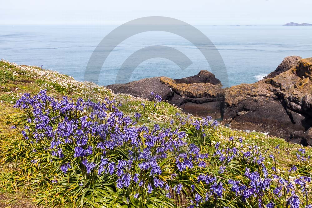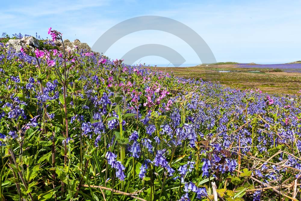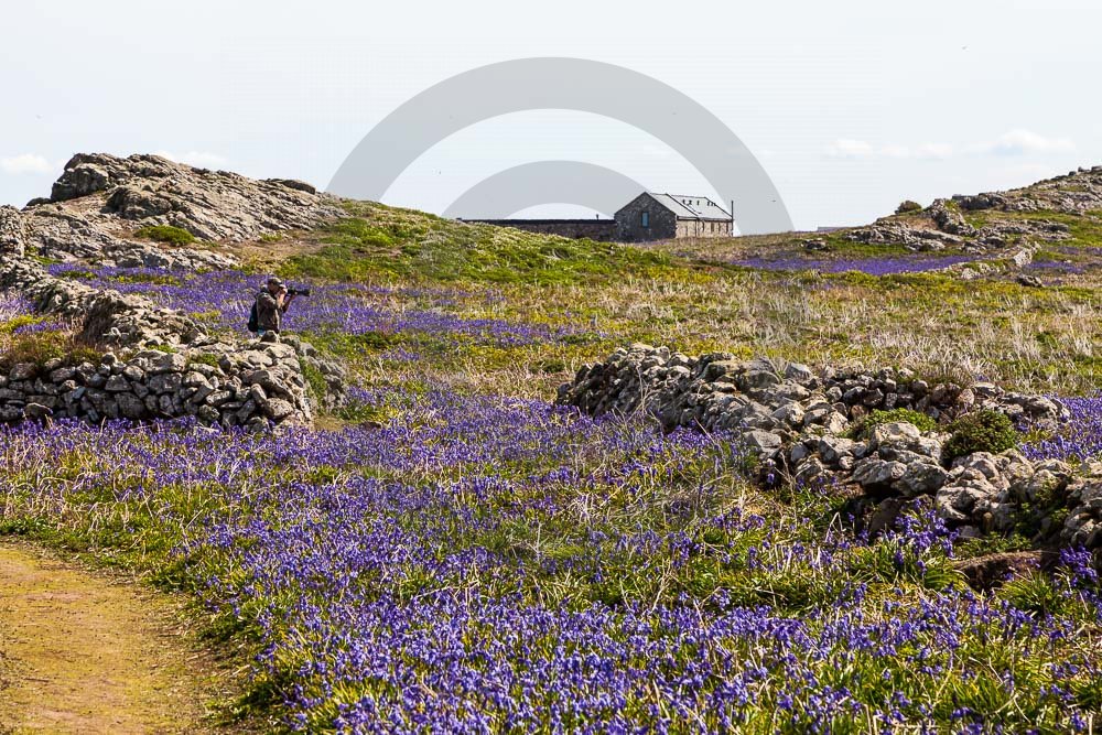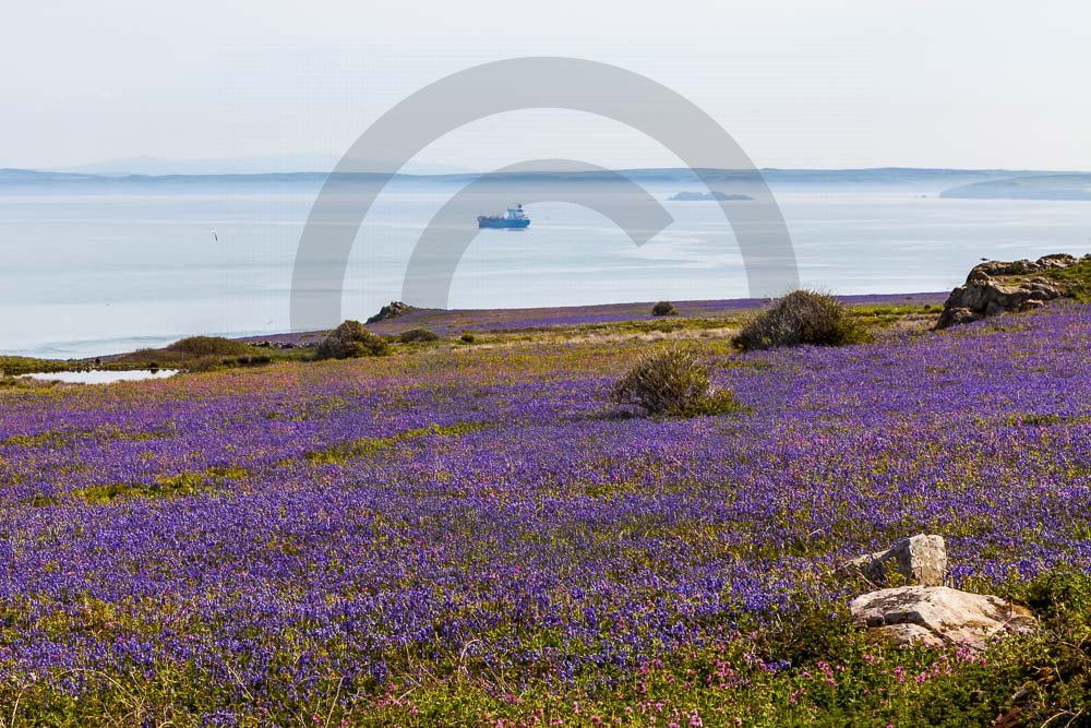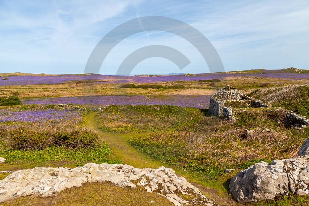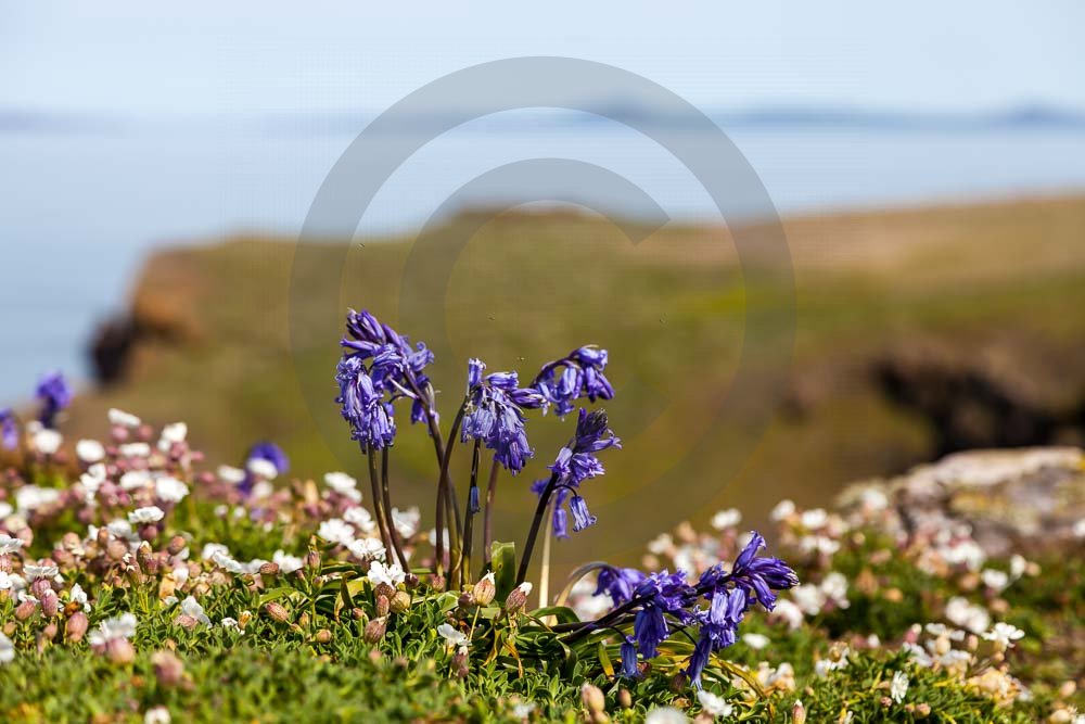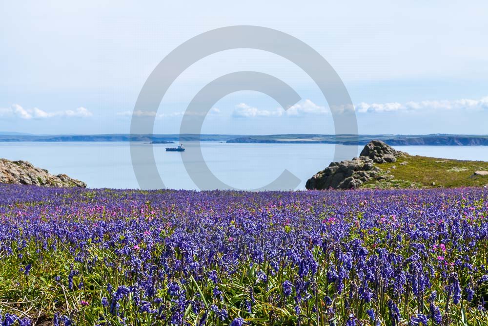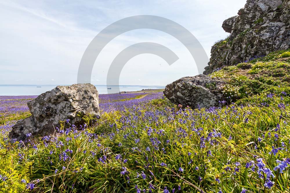 The island of Skomer off the west Wales coast in Spring with bluebells and some red campion. Views across the island and some details, buildings and the boat over.
