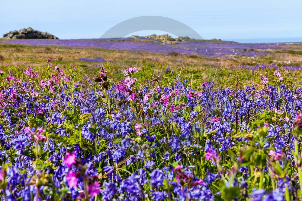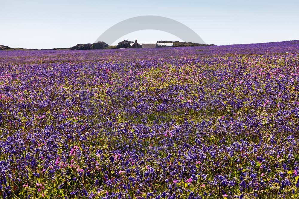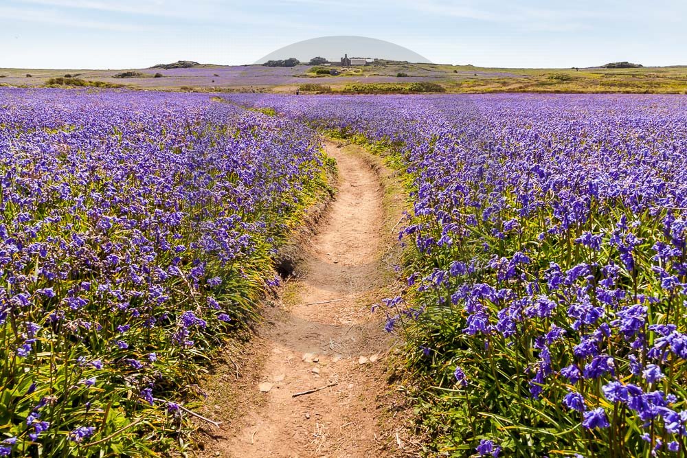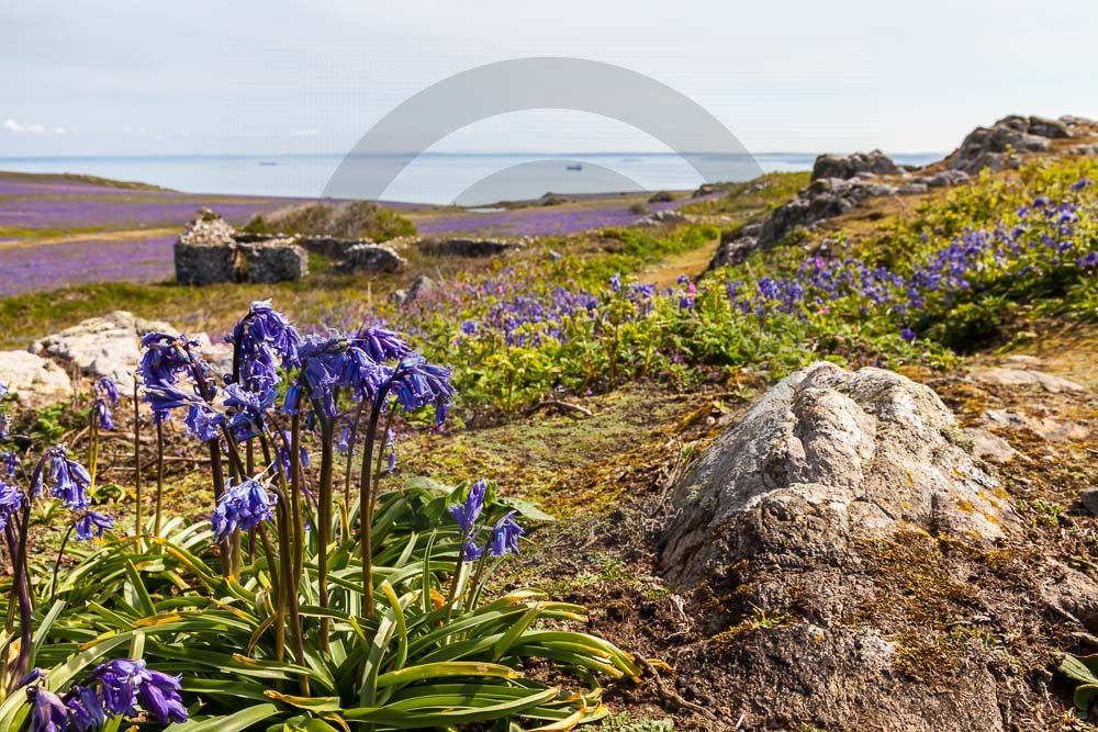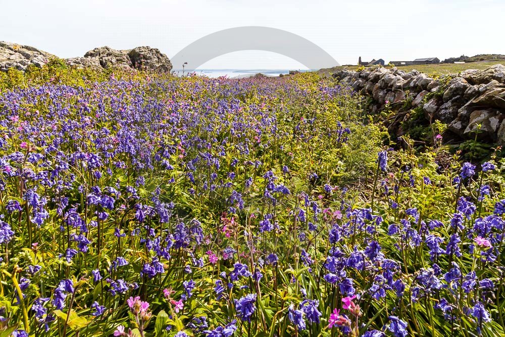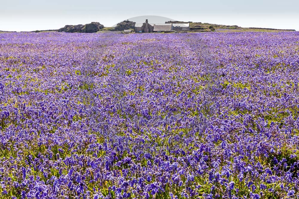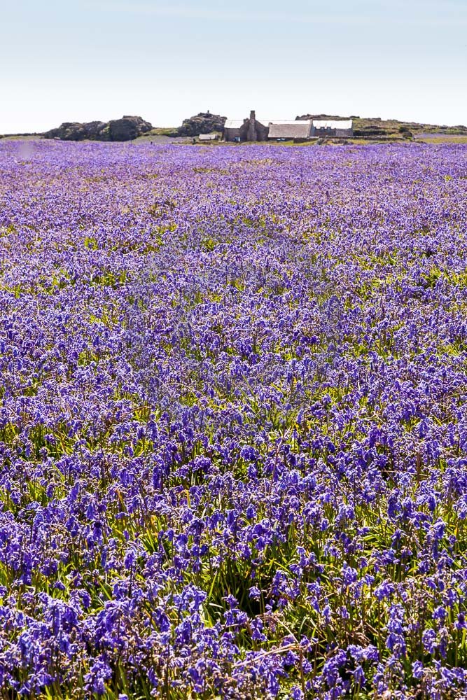 The island of Skomer off the west Wales coast in Spring with bluebells and some red campion. Views across the island and some details, buildings and the boat over.