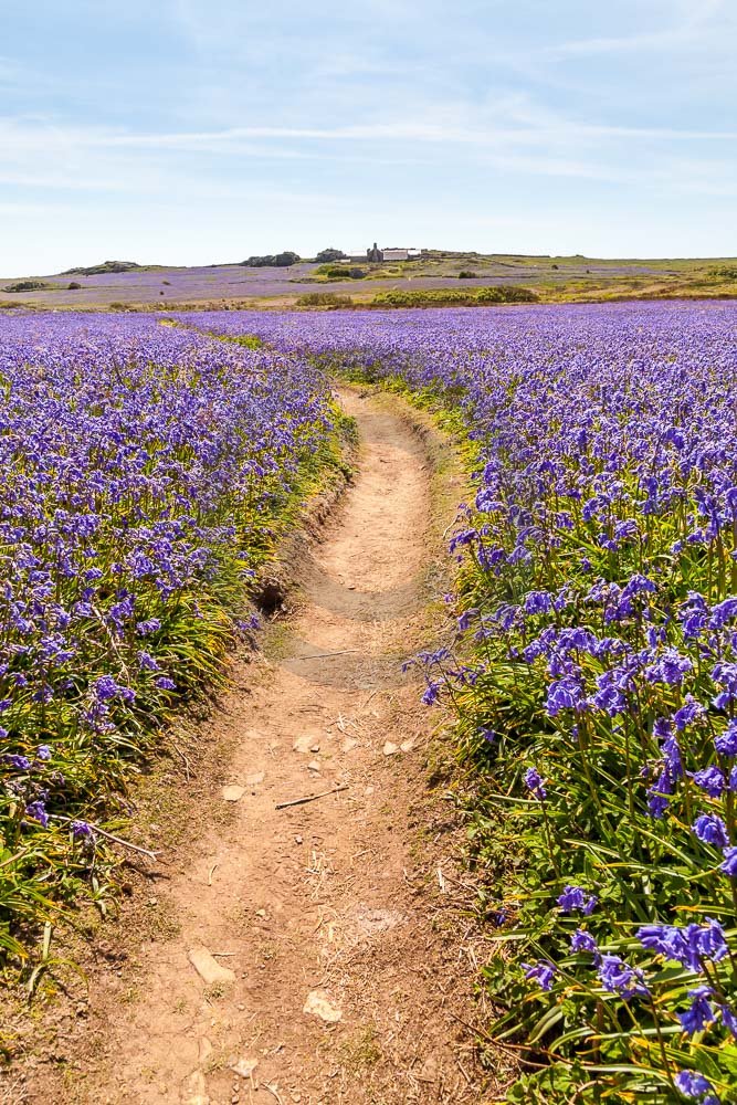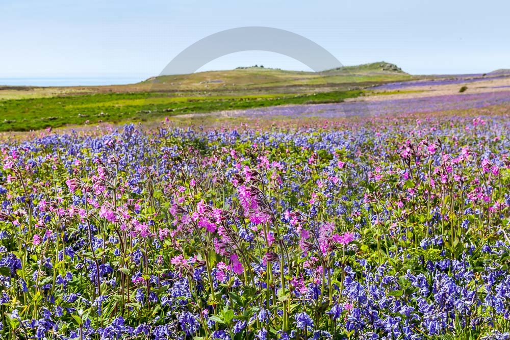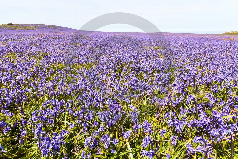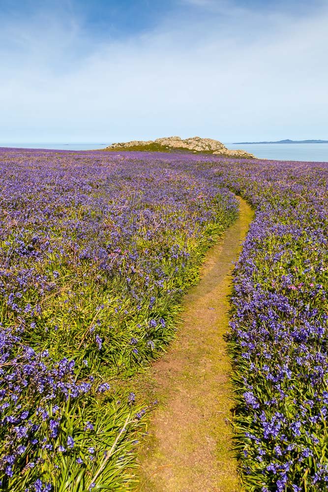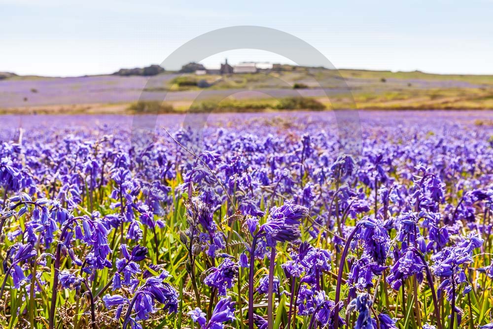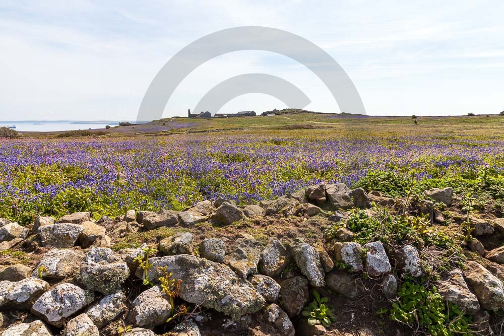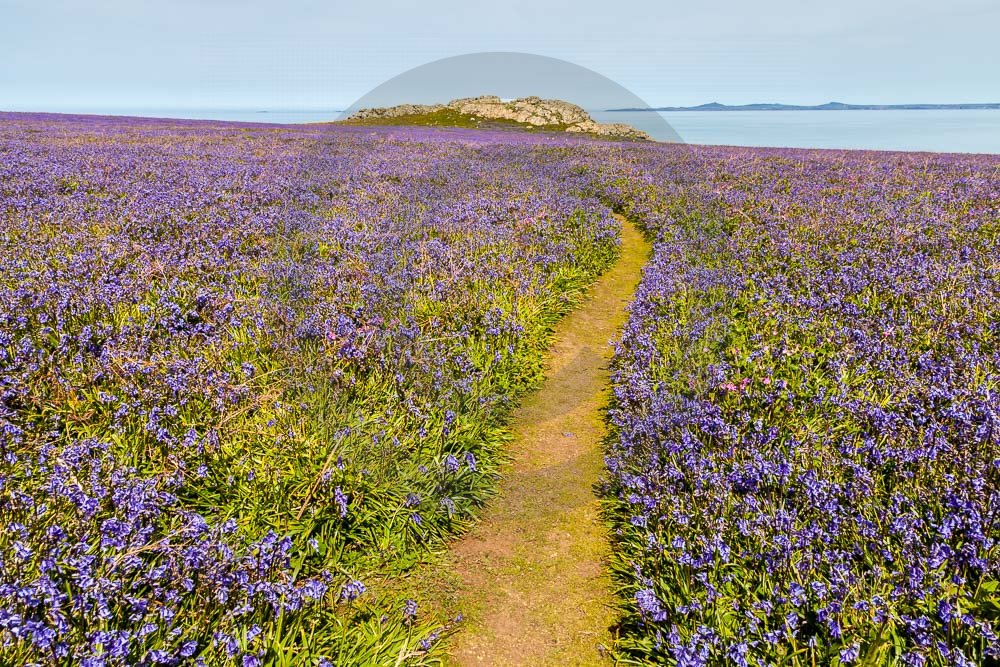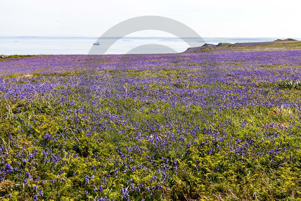 The island of Skomer off the west Wales coast in Spring with bluebells and some red campion. Views across the island and some details, buildings and the boat over.