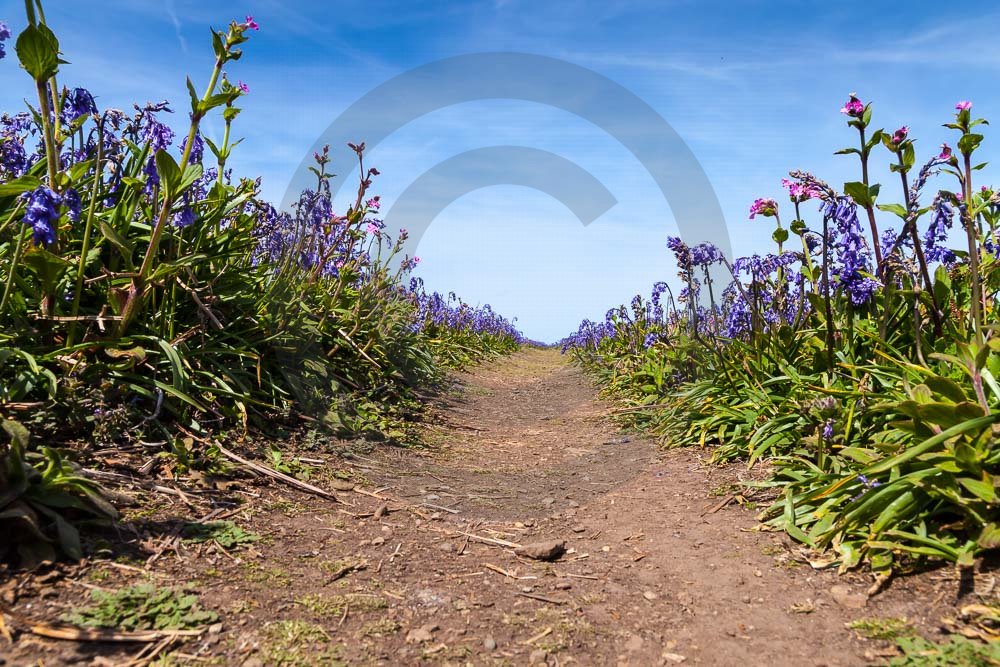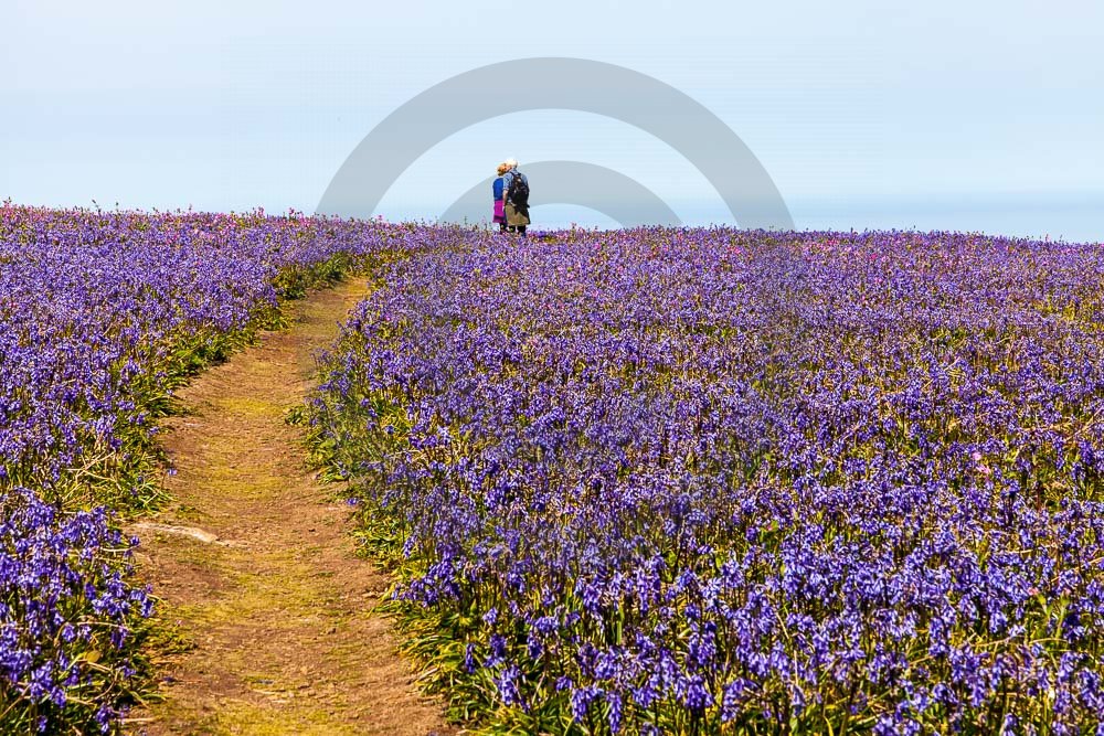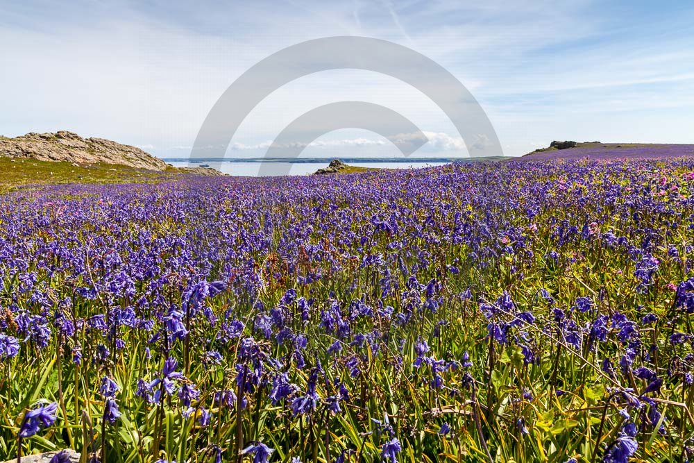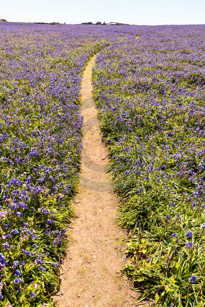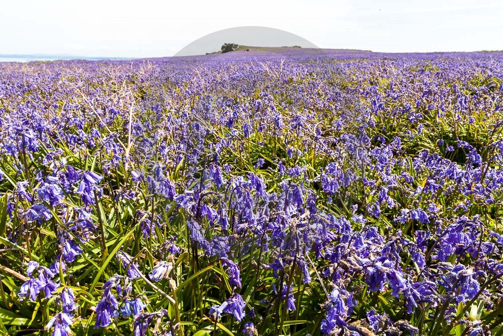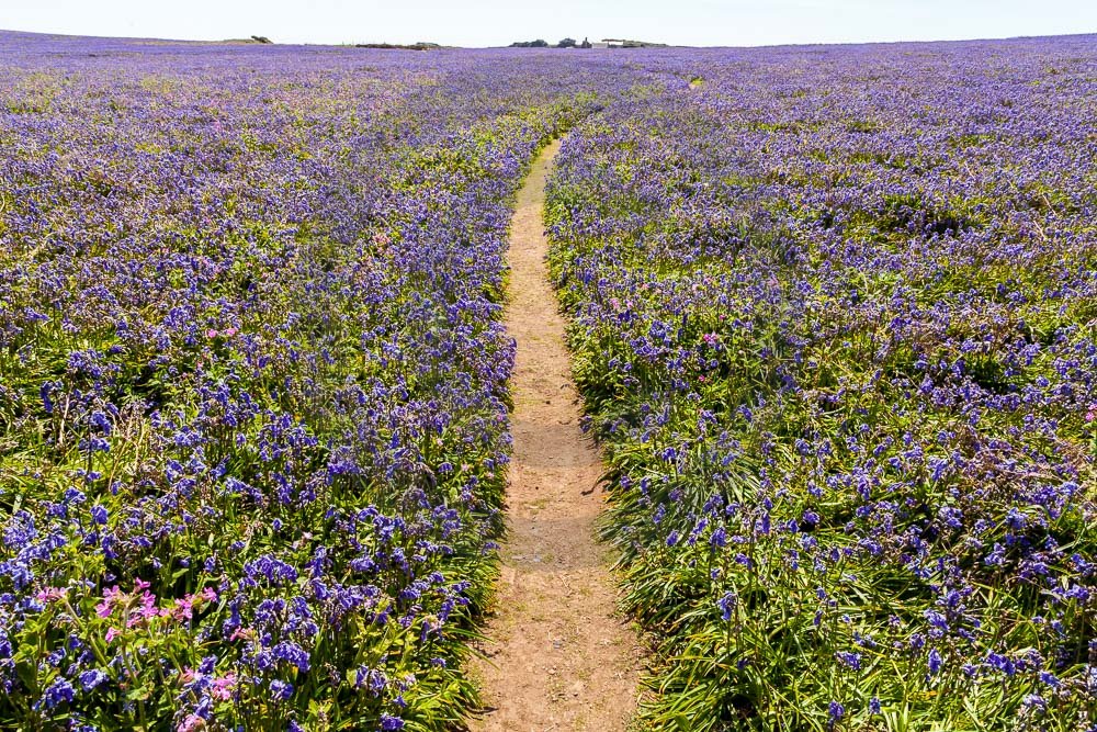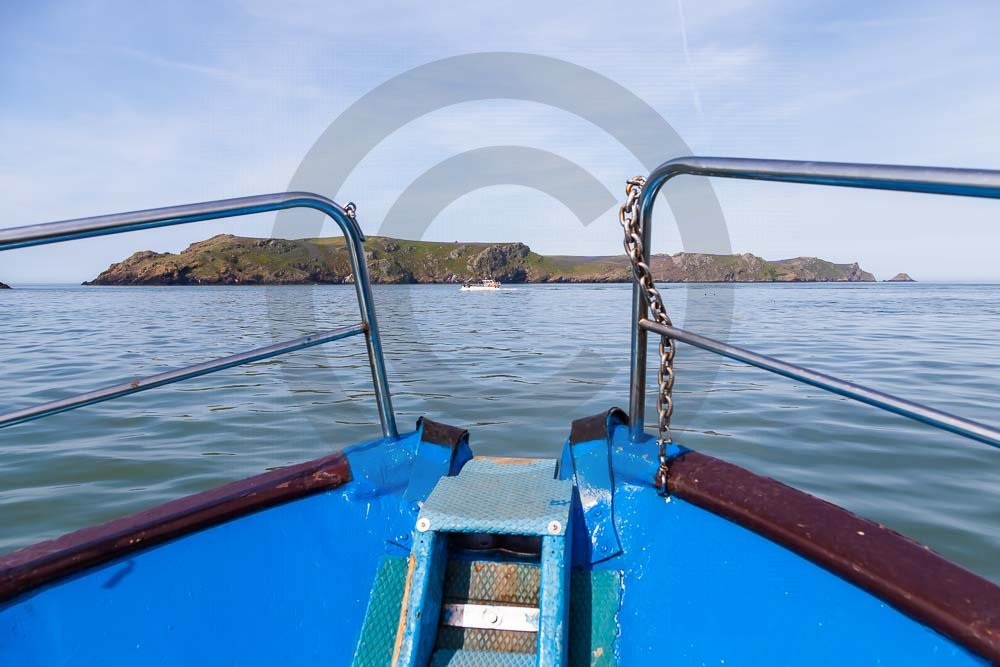 The island of Skomer off the west Wales coast in Spring with bluebells and some red campion. Views across the island and some details, buildings and the boat over.