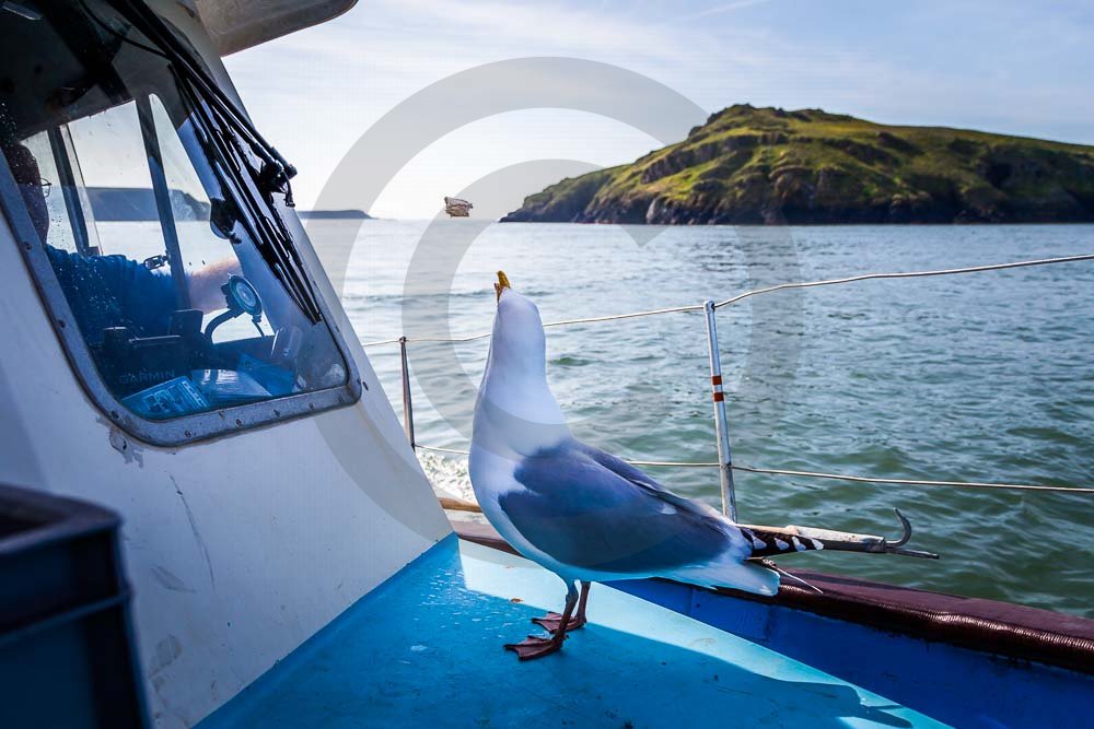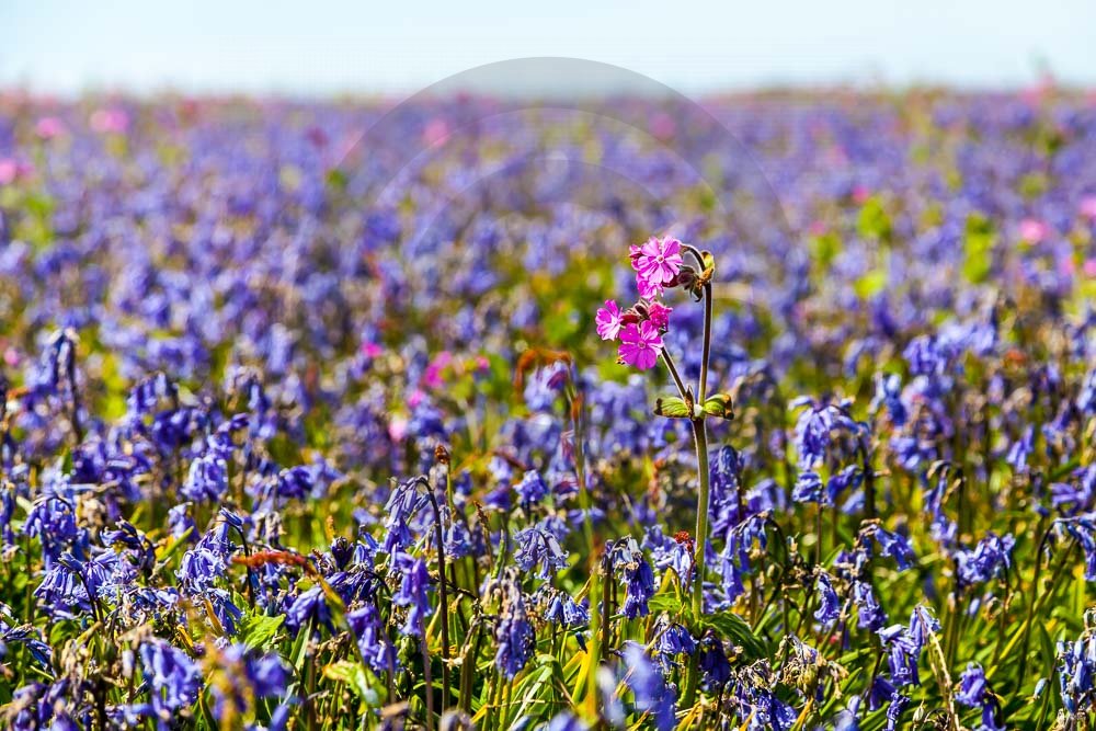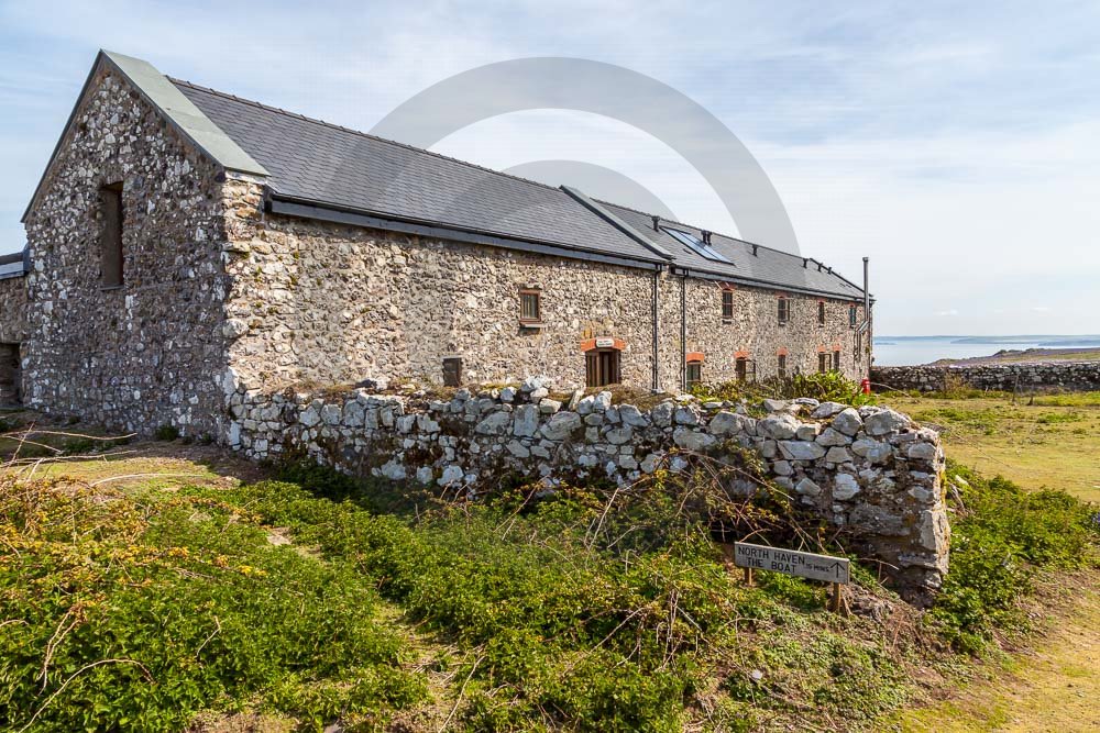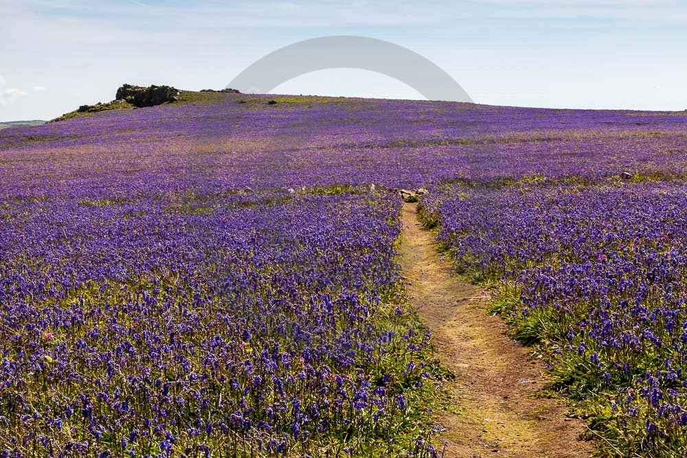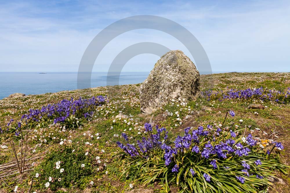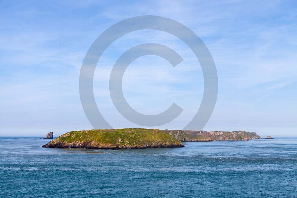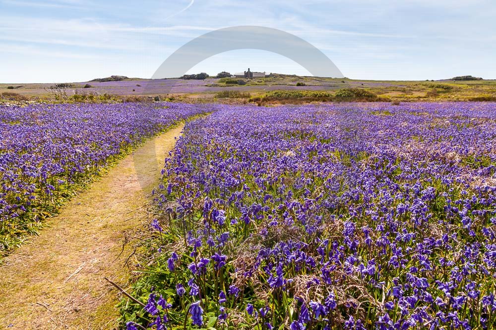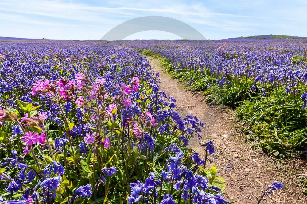 The island of Skomer off the west Wales coast in Spring with bluebells and some red campion. Views across the island and some details, buildings and the boat over.